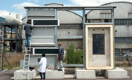 The research teams work with a mock-up of a 20-square-metre roof structure (5x4m) that can be tilted up to 60 degrees and oriented in any direction. This realistically replicates roof pitches and other components of the building envelope. A monitoring system is connected to the structure to measure parameters such as electrical power, temperature and radiation effects – and thus the efficiency of the installed modules – in real time. A model façade (4x6m) allows the performance of photovoltaic modules integrated into solar-active façades to be tested in the laboratory under realistic conditions. To maximise the reality of these conditions, care was taken in the construction of the test façade to ensure that it can effortlessly support heavy façade components in all weather conditions. The structure is divided into six 2x2m modules and can thus support several components simultaneously. The test façade’s measuring system can also assess complex systems in which, for example, photovoltaic systems, electrical storage modules and control systems are combined.