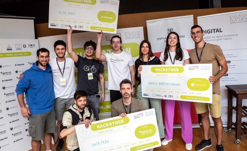 Due aziende locali e un progetto transnazionale europeo hanno consegnato i premi e lanciato le sfide dell'edizione di quest'anno. L'azienda high-tech Gruppo FOS ha chiesto di sviluppare un'applicazione mobile che fornisse i dati di Open Data Hub su richiesta. Obiettivo raggiunto dal gruppo DataPeak che, con la sua applicazione, ha collegato dati su eventi, hotel e trasporti pubblici, creando un'esperienza intuitiva e coinvolgente. Lifeware, società di software per l'amministrazione di prodotti assicurativi sulla vita, invece, ha affidato ai team il compito di programmare un sistema di assistenza per lo sviluppo dei software che fornisse suggerimenti di codifica. La squadra Pota ha ottenuto un ottimo risultato creando un prototipo di sistema che suggerisce in tempo reale le linee di codice da digitare per lo sviluppo software, basato su un modello AI. Il progetto europeo Matrycs, invece, che si occupa dello sviluppo di infrastrutture di gestione dei dati per il controllo energetico degli edifici, ha invitato i e le partecipanti dell'hackathon a sviluppare un modello predittivo della temperatura interna di un edificio basato sui dati del progetto Matrycs. L'obiettivo era facilitare la gestione energetica degli edifici e migliorarne l'efficienza. La giuria è stata convinta dalla proposta di Energy awareness in buildings, che ha creato una piattaforma che dà la possibilità agli utenti di caricare dati per visualizzare il consumo energetico dei loro edifici. L'applicazione memorizza anche progetti di utenti precedenti per mostrare i possibili miglioramenti attraverso i Big Data.